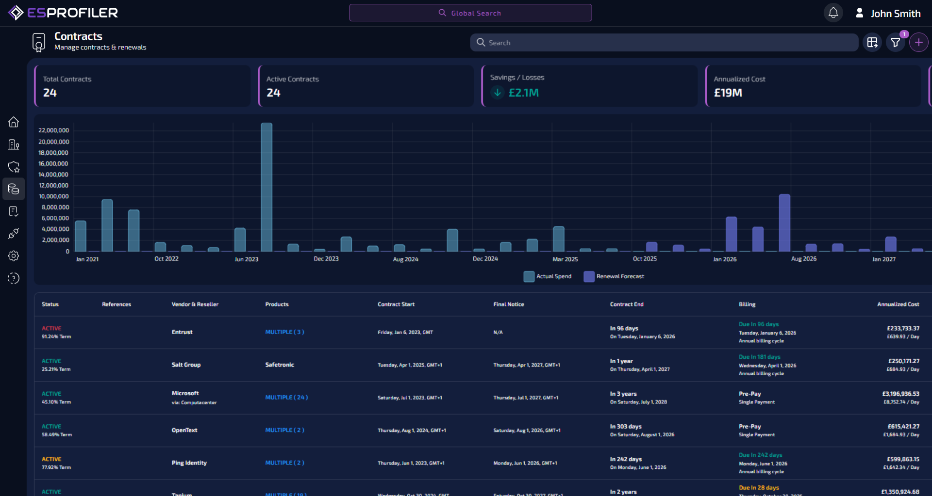 ESPROFILER solves this by integrating seamlessly with your procurement system, automatically detecting security-related contracts and providing early insights into costs, renewal dates, and contractual terms, keeping you in control.